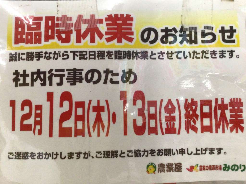 【12月12日・13日】 臨時休業いたします